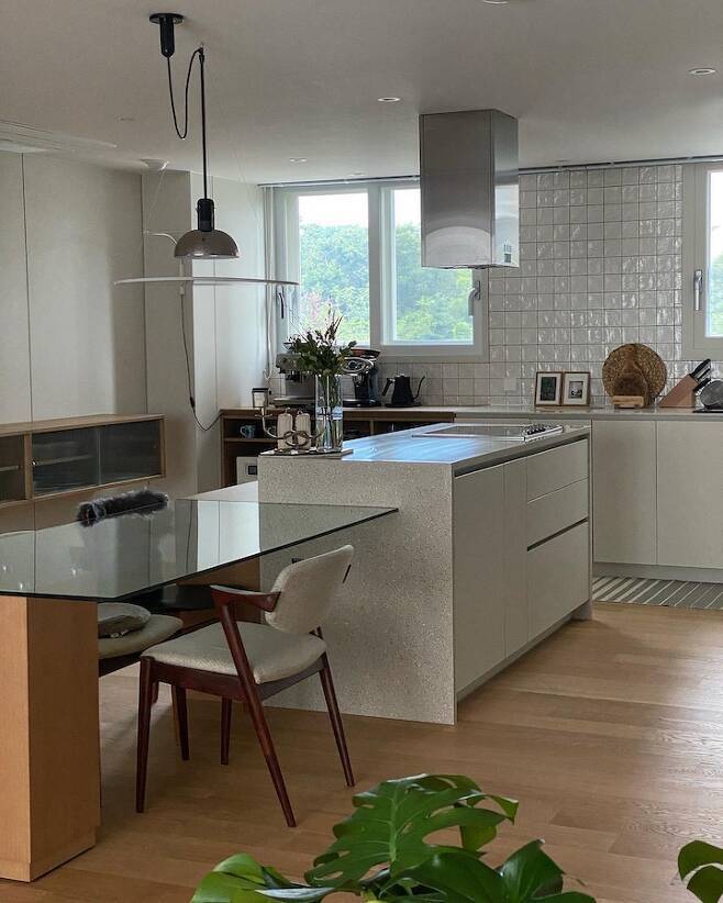 발코니 확장으로 숨겨져 있던 숲 뷰를 다이닝 공간에서도 즐길 수 있게 되었습니다.