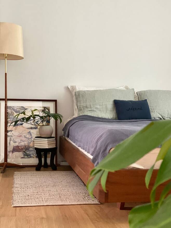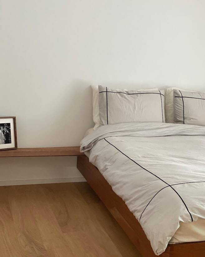 기존 가구들을 그대로 가지고 왔지만 그림과 소품만으로도 이전 집과는 또 다른 분위기가 납니다. 침대는 헤드가 없어 유행에 민감하지 않아 다양한 공간으로 변신이 가능하죠.