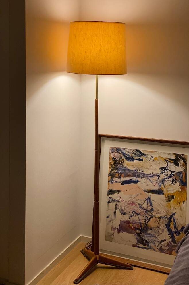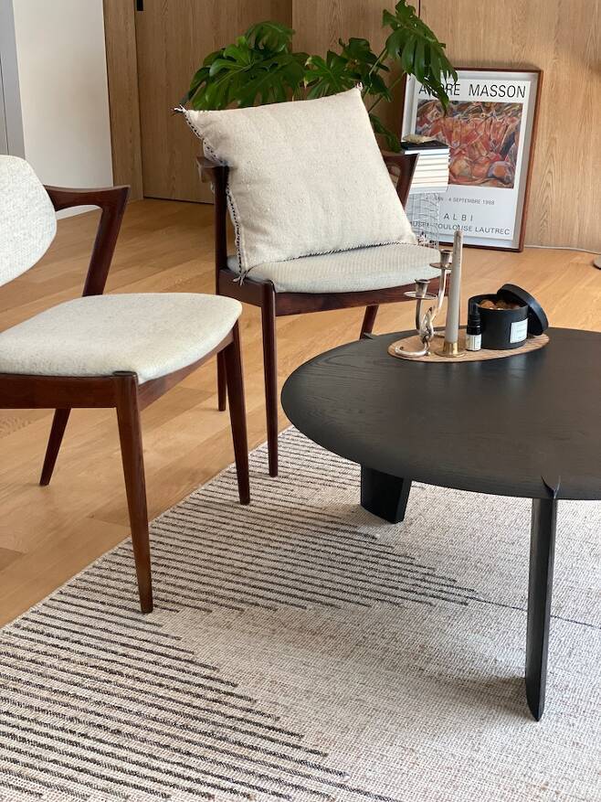 소품이나 가구는 시간을 오래 두고 천천히 채우는 편입니다. 가장 최근에 구입한 것이 소파 테이블인데, 국내 작가의 작품으로 둥근 상판에 보는 각도에 따라 면이 되기도 선이 되기도 하는 다리를 가졌어요. 동양적인 디자인에 반해 오랜 시간 눈여겨보다 구입했습니다. 기존 Kai Kristiansen의 빈티지 의자 와도 튀지 않고 나뭇결이 잘 살아 있어 구입 후 더 마음에 들어요.