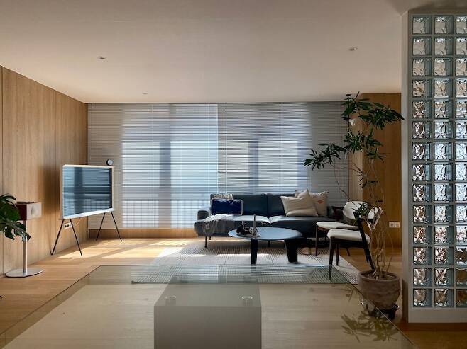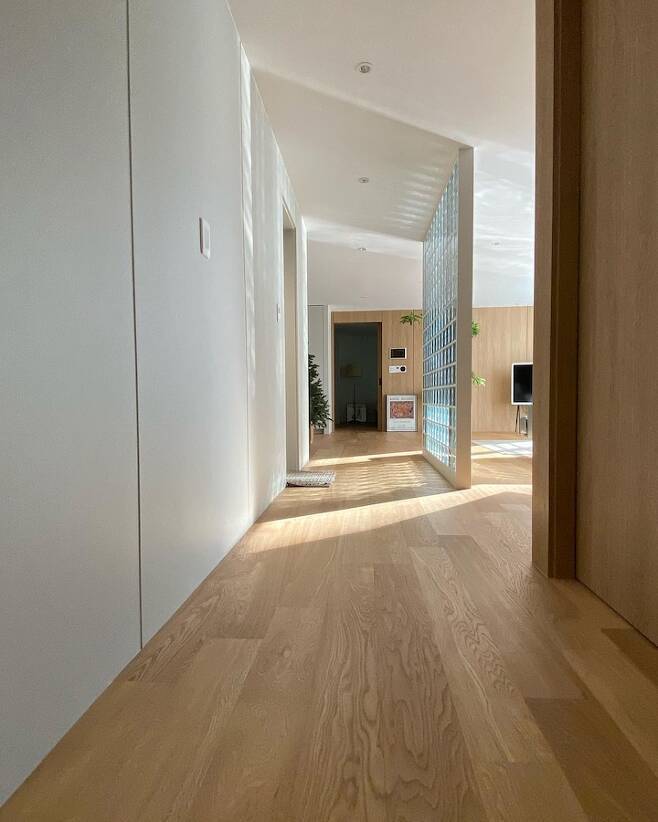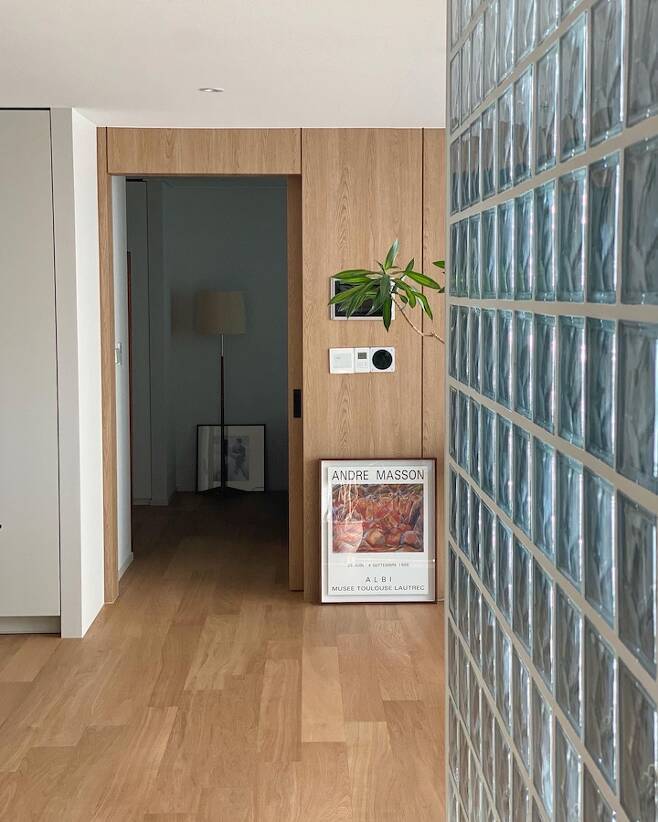 유리블록을 사이에 두고 복도와 거실이 보이는 모습입니다.