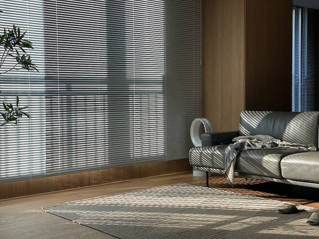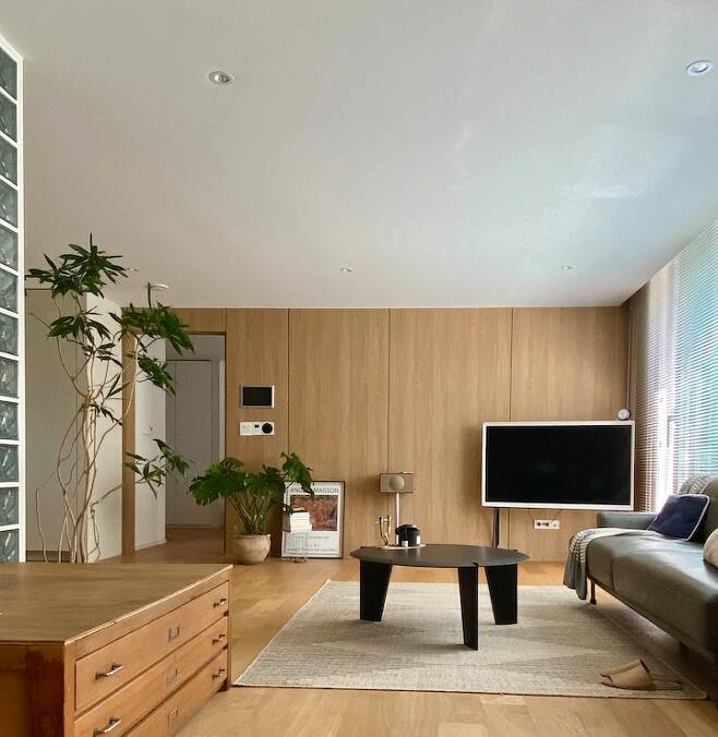 거실은 우리 부부가 가장 많은 시간을 보내는 공간입니다. 큰 가구를 최소화하고 낮은 가구를 배치해 여유를 주고 싶었습니다. 창은 커튼 대신 시각적으로 깔끔하고 관리가 쉬운 알루미늄 블라인드를 사용해 우드의 무겁고 따뜻한 느낌과 대비를 주고자 했습니다.