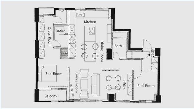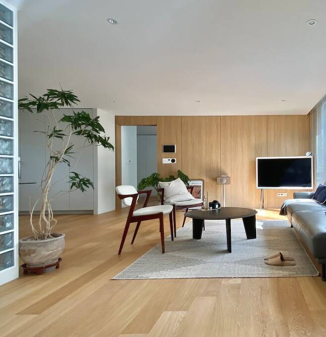 이전 집을 살면서 가장 크게 느낀 것은 공간의 사용성이었습니다. 필요하지 않은 공간은 짐만 두게 되니 필요에 따라 공간의 크기를 달리해야 한다고 생각했어요. 그래서 사용성이 많이 없는 팬트리 공간과 발코니, 알파룸까지 가벽을 삭제하고 합치면서 최대한 공간을 간결하고 깔끔하게 만들었습니다.