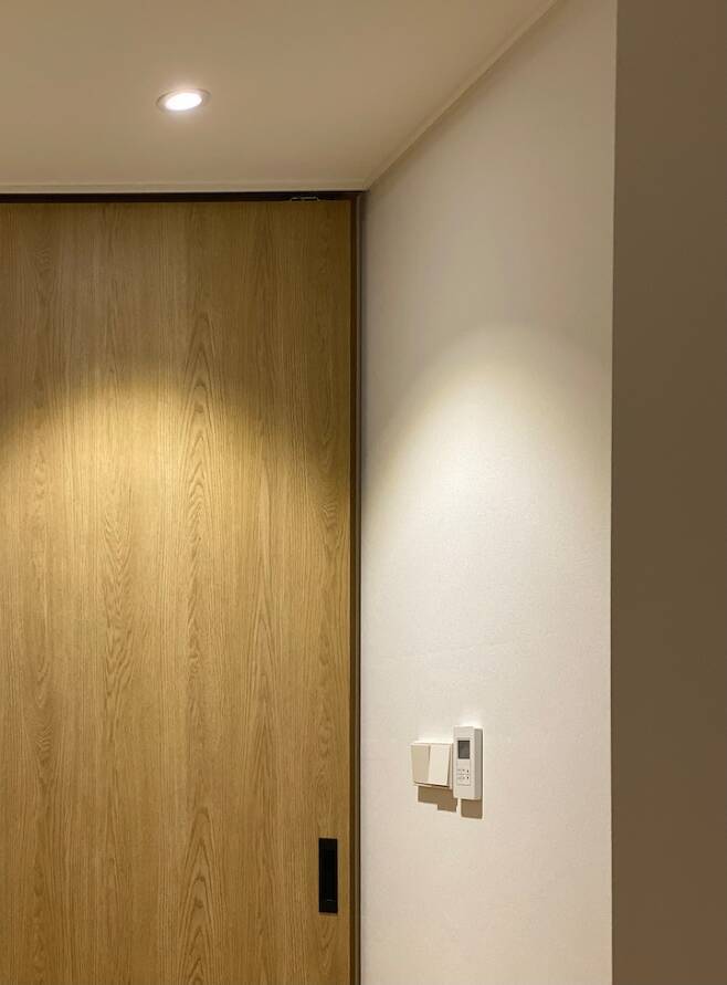 현관에서 바라본 복도의 모습이에요. 현관이 좁고 꺾여 있는 구조라 중문으로 분절된 느낌을 주기보다, 현관을 들어와서 확장된 공간으로 자연스럽게 돌아 들어갈 수 있는 흐름을 주고 싶었습니다.
