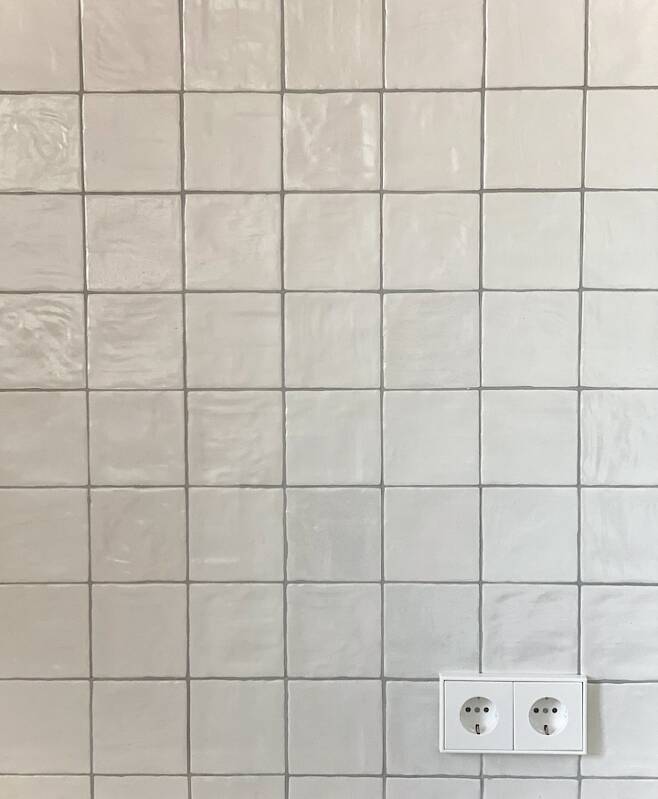 작은 폭의 무광 타일은 빛에 따라 질감이 달리 보여서 오묘한 모습입니다. 눈에 띄는 모든 곳은 융 콘센트를 사용하였습니다. 수전에 가까운 콘센트는 방우형으로 커버를 추가해 안전에도 신경 썼습니다.
