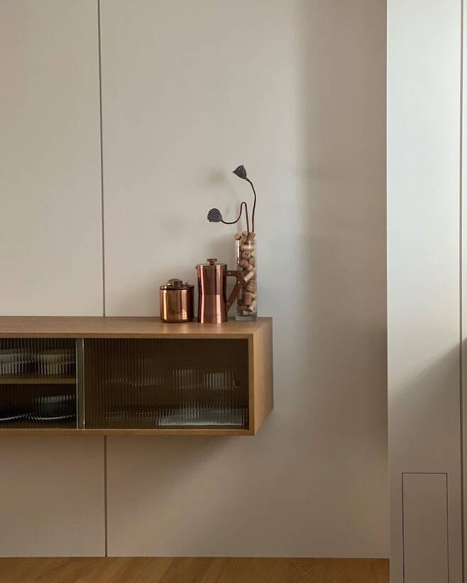 우드와 유리가 사용된 벽 선반을 이용해 수납과 디자인 효과 up!