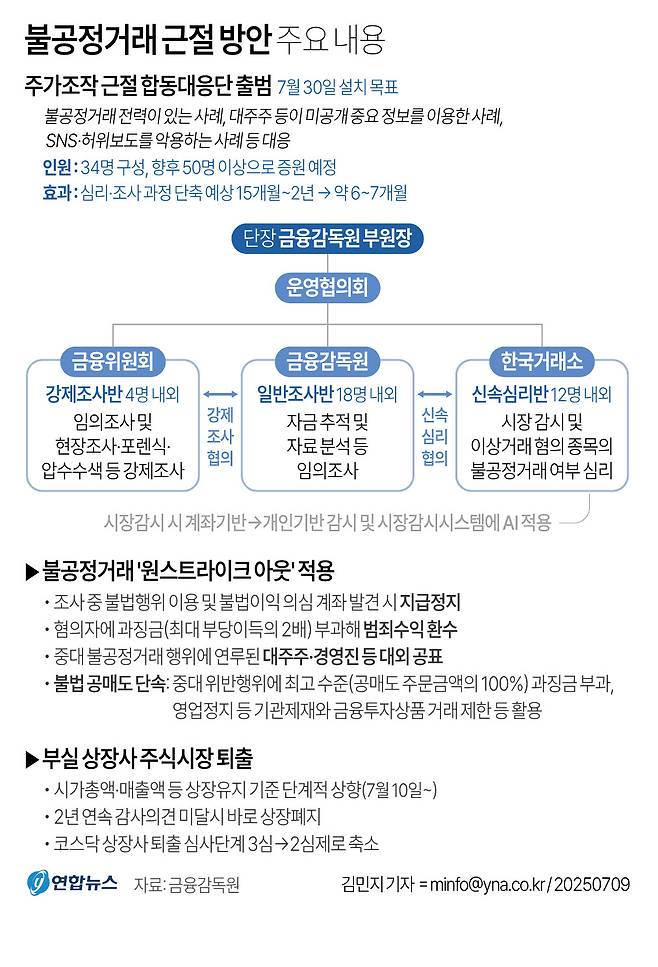 금융위원회와 금융감독원, 한국거래소는 오는 30일 이재명 대통령이 강조한 불공정거래 척결을 위해 '주가조작 근절 합동대응단'을 가동한다.