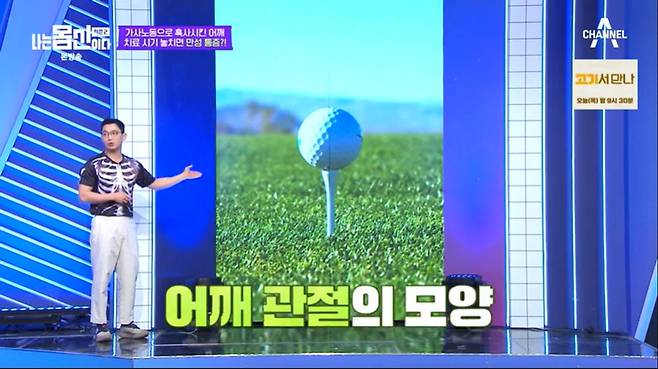 김일천 신경외과 전문의는 골프티 위에 골프공이 올려져 있는 사진을 보여주며 어깨를 설명했다. 김일천 전문의는 "어깨는 부드럽게 자유자재로 움직일 수 있는게 고정되어 있지 않아 빠지기가 쉽다. 우리가 어깨를 360도 다 쓸 수 있는 이유는 공과 소켓 모양의 어깨 관절 구조 때문이다. 어깨를 잡아주고 있는건 어깨에 있는 근육과 힘줄 밖에 없다. 그 만큼 손상되고 다치기 쉽다"고 설명했다.