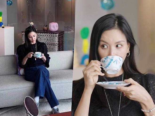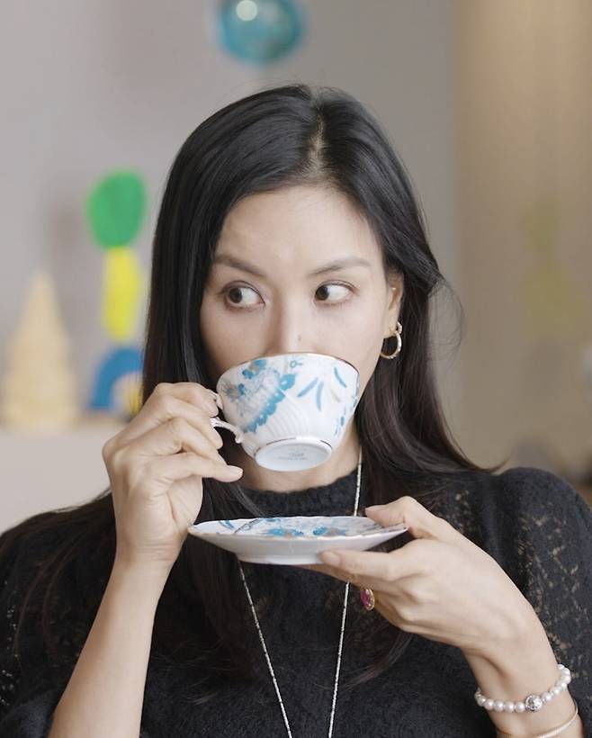 블루 패턴의 찻잔을 든 손끝까지도 고소영스러움이 배어 있었으며, 그 분위기마저 하나의 광고 컷처럼 고급스러웠습니다.