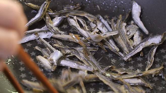 두꺼운 프라이팬에 '중불'에서 식용유를 넣고 달군 후 멸치를 1분간 볶아주세요.