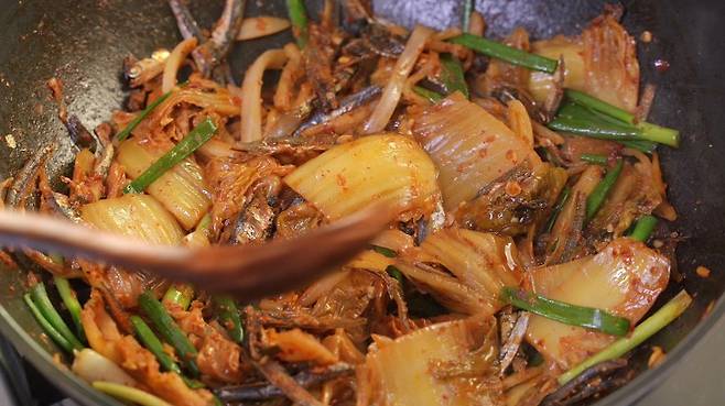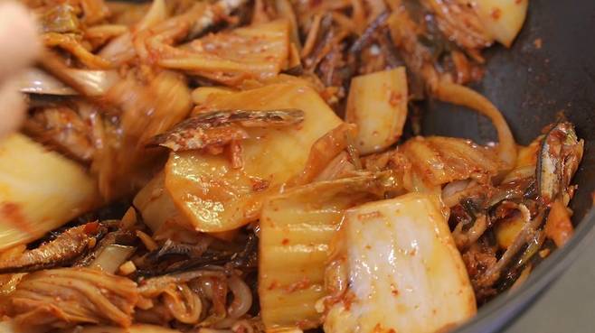 볶은 멸치에 김치, 김치국물을 넣은 후 섞어 주고