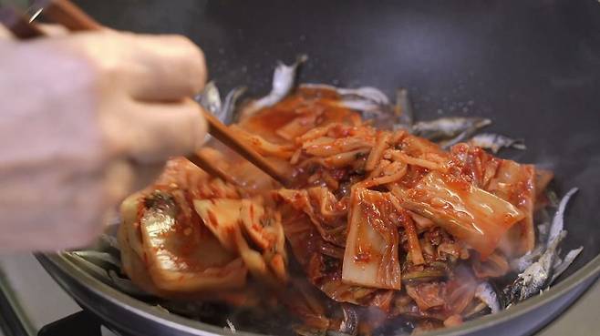 김치를 3분간 볶아주세요.