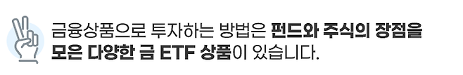 금 ETF는 펀드와 주식의 장점을 모은 상품입니다. 주식처럼 한국거래소에 상장되어 있기 때문에 손쉽게 매매할 수 있다는 것이 특징입니다. 또한 금 선물에 투자하기 때문에 레버리지 ETF, 인버스 ETF도 상장되어 있습니다.