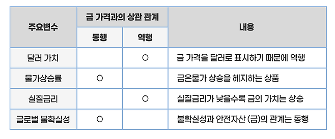 일반적으로 세계 경제가 어려워지면 위기를 극복하고자 동시다발적으로 돈을 푸는 정책을 실행하며, 시장에 풀린 돈에 따라 금 가격은 주로 움직입니다.