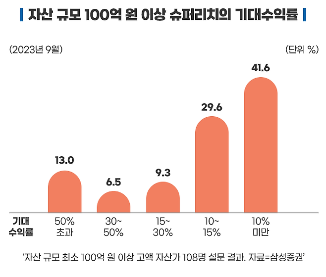 아래의 설문 결과를 보시면, 약 70%의 자산가들이 15% 이하의 기대수익률을 생각하고 있다는 것을 알 수 있습니다. 게다가 10% 미만은 41.6%나 됩니다. 부자들의 수익률에 대한 기대치가 일반인이 생각하는 것보다 그리 높지 않습니다.
