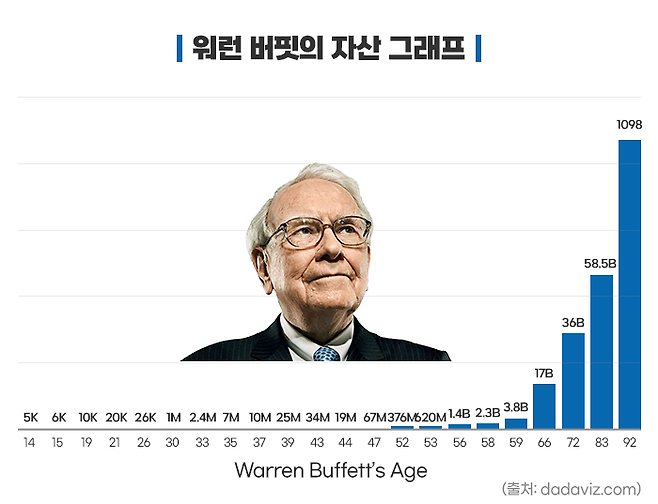 우리가 잘 아는 워런 버핏도 하루아침에 큰 부를 거머쥐고 유명하게 된 것은 아닙니다. 워런 버핏이 눈에 띄는 성과를 이루게 된 것 50대가 넘어서이고 현재 그가 가진 자산은 60대 후반에 본격적으로 커지기 시작했습니다.
