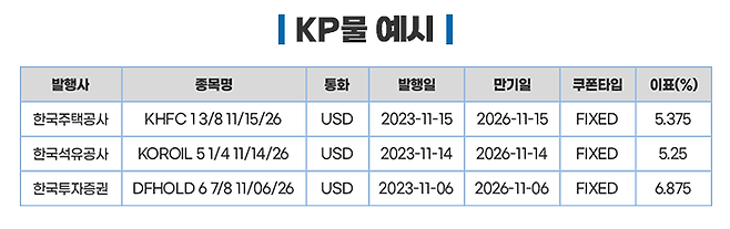 한국 정부, 공기업, 금융회사, 기업 등에서 외화 조달을 위해 해외 금융시장에서 발행한 채권입니다. 보통 이런 외화표시 채권을 KP(코리안 페이퍼)라고 합니다. 쉽게 말해서 우리나라 한국석유공사 같은 기관이 달러로 채권을 발행하는 것입니다.