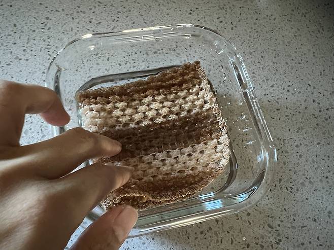 수세미를 그릇에 맞춰 잘 접어서 넣어주세요