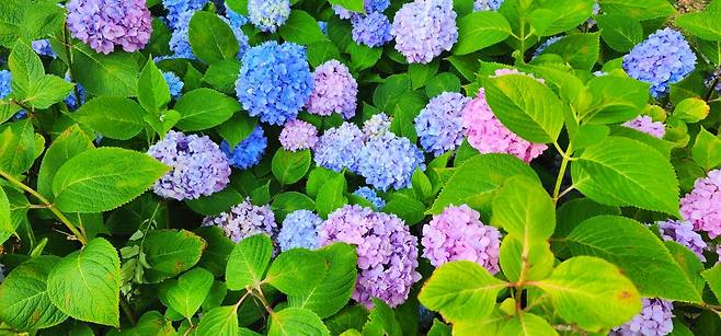 회화나무를 중심으로 건강한 터전을 마련하기 위해 조성된 작은숲공원에는 그와 어울리듯 수국도 함께 식재되었습니다. 여름이면 푸르른 잎으로 그늘을 만들어주는 회화나무 아래, 형형색색의 수국이 피어납니다. 오리지널 블루 수국과 핑크빛 수국이 교차하며 만들어내는 풍경은 작지만 감탄을 자아내기 충분합니다.