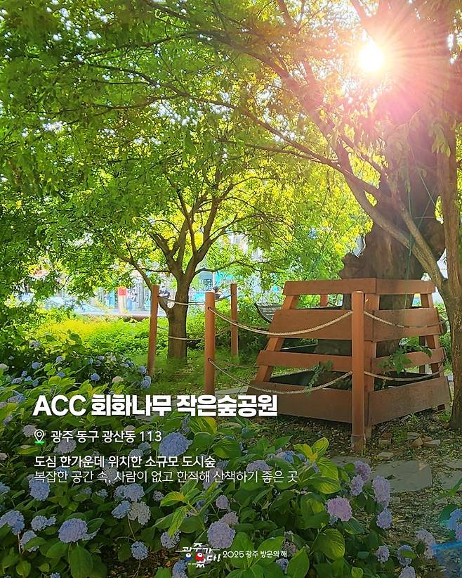 광주 중심가에서 특별한 여름 풍경을 만나고 싶다면, 국립아시아문화전당 내 5·18민주광장 한켠에 자리한 ‘회화나무 작은숲공원’을 추천합니다. 널리 알려지지 않은 이 작은 공원은 아는 사람만 안다는 광주의 조용한 수국 명소입니다.