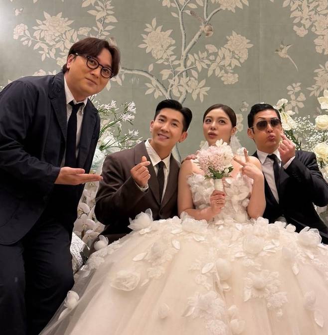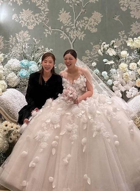 신부대기실에서는 또 다른 웨딩드레스를 착용했는데, 세상에… 꽃 장식이 진짜 사랑스러웠어요! 🥰 지인분들과 사진 찍으셨는데, 신지 언니랑도 찰칵! 브라이언, god 준, 개그맨 황제성 님도 함께했네요! 📸 다들 축하해주러 오셨나 봐요! 🥳