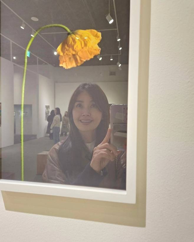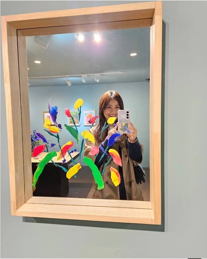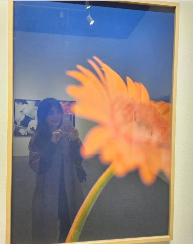 배우 신애라가 15일 인스타그램에 "액자에 비치는 내모습과 꽃을 함께보라는 작가의 말이 마음에 와닿았다. 강렬하고 화려하게 활짝 핀 꽃들도 아름다웠지만, 윤기잃고 저물어가는 고개숙인 꽃한송이의 아름다움. 원숙과 겸손의 향기를 품은 그모습, 닮고싶다."라는 글과 함께 여러 장의 사진을 게재했습니다.
