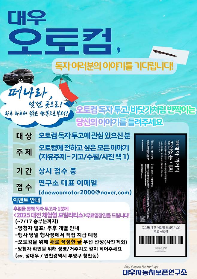 대우자동차보존연구소(이하 '연구소')가 사외보 「오토컴」 4호 발간을 앞두고 독자투고 이벤트를 실시한다. 「오토컴」 매거진은 창간호부터 독자 투고를 상시 접수하고 있다. 특히 이번 4호는 <2025 대전 체험형 모빌리티쇼> 무료 입장권 제공 이벤트가 동시 진행된다. 이벤트 접수는 7월 17일 투고 분까지 가능하며, 당선작은 26일 배포될 「오토컴」 특별호에 공개된다.