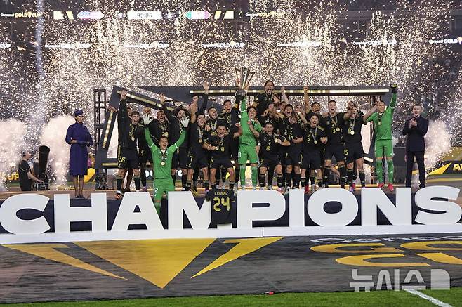 [휴스턴=AP/뉴시스] 멕시코 선수단이 6일(현지 시간) 미 텍사스주 휴스턴 NRG 스타디움에서 열린 2025 북중미카리브해축구연맹(CONCACAF) 골드컵 정상에 올라 트로피를 들고 환호하고 있다. 하비에르 아기레 감독이 이끄는 멕시코는 결승전에서 마우리시오 포체티노 감독의 미국에 2-1 역전승을 거두고 우승컵을 들어 올렸다. 2025.07.07.