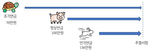 예컨대 정상적으로 연금을 받으면 월 100만원이 지급되는 A씨가 5년 일찍 연금을 받는다고 하면 월 70만원으로 깎이고, 5년 늦은 시점부터 연금을 받기로 하면 월 136만원씩 평생 받게 되는 식이다.