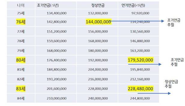 그렇다면 정상연금을 받는 사람이나 연기연금을 받는 사람은 언제 조기수령자의 총 연금액을 추월하게 될까. 정원준 세무사에 따르면 A씨의 정상연금액은 76세에 조기연금액을 앞지르게 되고 연기연금 총액은 80세가 되면 정상연금액을 추월하게 된다. 83세까지 생존할 경우에는 정상연금을 받는 것보다 5년 늦은 연기연금을 받는 게 유리하다. 즉, 오래 살수록 연금을 늦게 받는 게 유리한 셈이다.