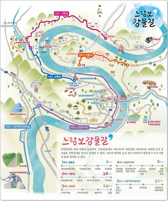 단양강 잔도길은 단양을 대표하는 걷기 코스인 ‘느림보강물길’ 5개 구간 중 핵심 구간에 해당합니다. 그래서, 단순히 잔도만 걷고 끝내기보다, 강변 산책로와 함께 이어서 걸으면 더욱 완성도 높은 동선이 만들어집니다.