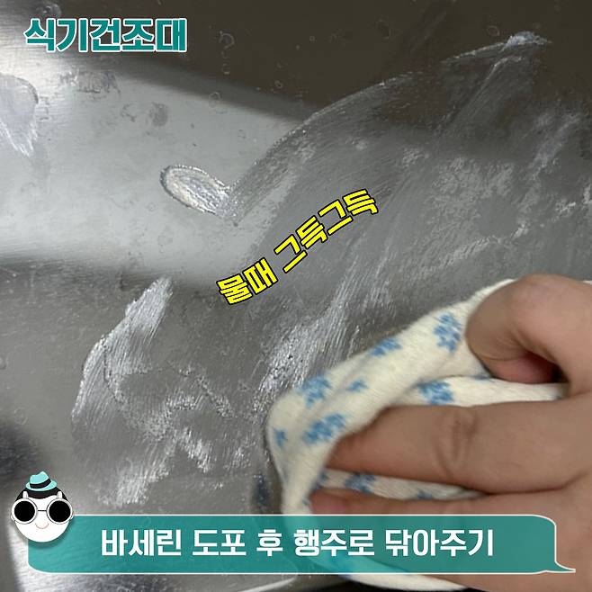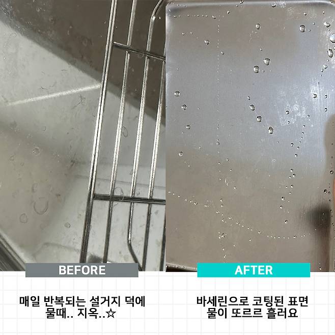 사용 방법은 간단해요. 식기건조대 세척 후, 물기를 모두 없애주시구요. 그 상태에서 바세린을 발라주세요. 그 후에는 마른 수건이나 행주로 깨끗이 닦아주면 끝.
