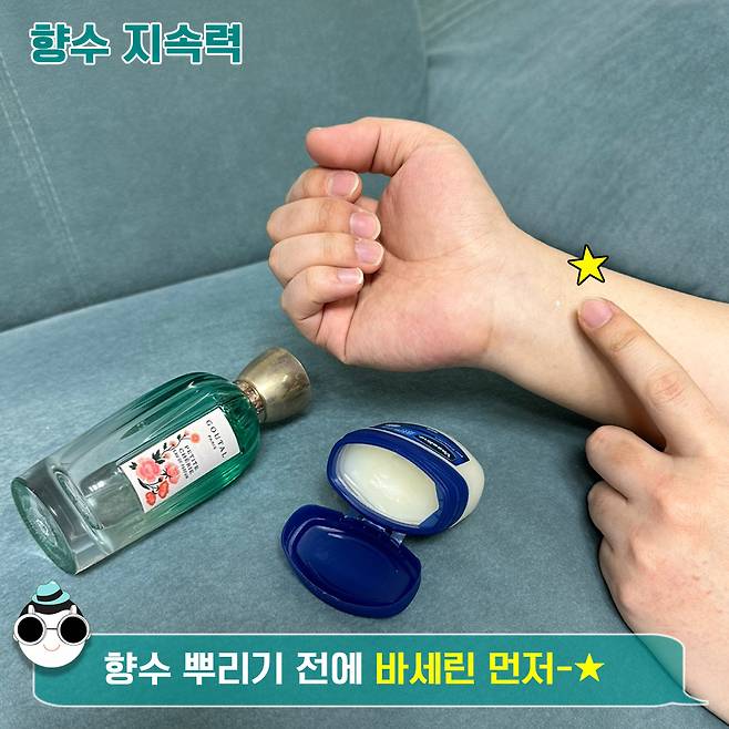 향수를 뿌리기 전, 해당 부위에 바세린을 먼저 얇게 발라보세요. 그 후에 향수를 뿌리면 향이 보다 오래 지속된다는 말씀.