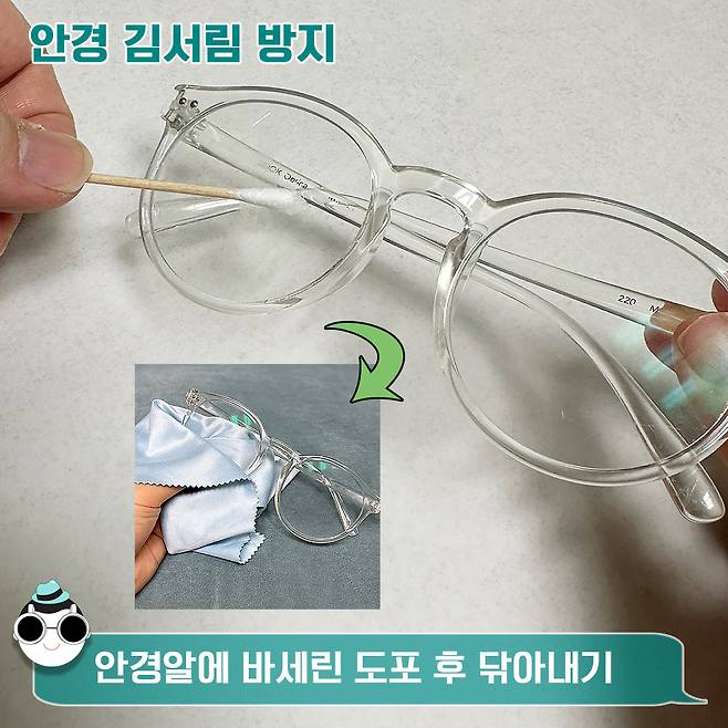 먼저 안경을 깨끗하게 세척한 후 면봉에 바세린을 소량만 묻혀 안경 표면에 발라줍니다. 그 뒤에 안경 닦이나 마른 천을 이용해 바세린을 골고루 문질러 ‘코팅’을 해주면 끝.