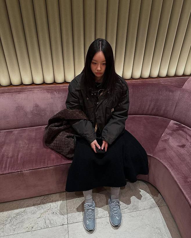 실내에서도 그녀의 무드는 이어졌다. 촘촘하게 패딩 처리된 벽면, 벨벳 같은 질감의 퍼플 쇼파 위에 앉은 혜리는 어떤 말도 하지 않아도 되는 얼굴을 하고 있었다. 검은 스커트는 종아리를 덮을 만큼 넉넉했고, 회색 니삭스와 뉴발란스 운동화는 소리 없이 안정감을 주었다. 손에 든 작은 스마트폰조차, 그녀의 이미지에서 벗어나지 않는다.