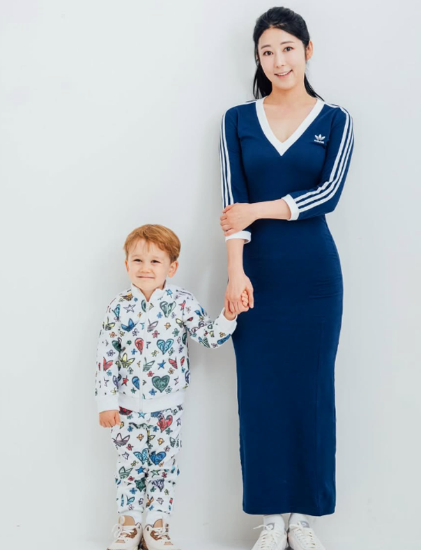 사유리는 아디다스의 시그니처 스트라이프가 들어간 네이비 컬러의 롱 슬리브 원피스를 착용해 세련된 애슬레저룩을 완성했다.
