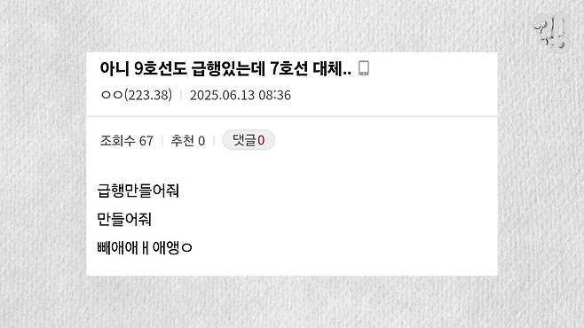이 사진을 보라. 모든 지하철에 급행 제도를 운영해 달라는 서울 출퇴근러들의 간절한 외침이다.
