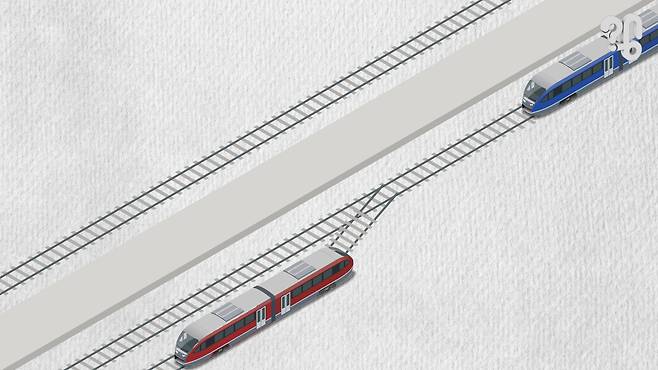 첫째, 대피로 건설에 돈이 많이 든다. 먼저 이걸 설명하려면 급행 운행의 기본 원리부터 알아야겠다. 급행 열차를 도입하려면 ‘추월’과 ‘대피’ 방책 마련이 필수다.정차역이 적은 급행은 필연적으로 앞에 가는 완행 열차를 따라잡게 된다. 그러면 완행은 역에 추가로 설치된 대피선에서 일단 대기한다.
