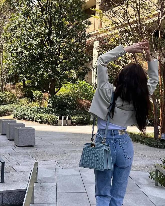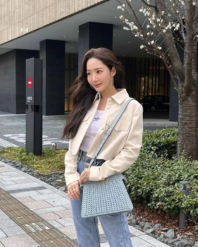 첫 번째 룩에서 박민영은 아이보리 톤의 크롭 셔츠 자켓을 활용했다. 안에는 심플한 화이트 티셔츠를 매치해 기본 아이템을 효과적으로 조합했으며 연청 데님 팬츠와 함께 편안하면서도 세련된 분위기를 만들었다. 특히 하늘색 계열의 니트 숄더백이 전체 코디의 포인트 역할을 했다. 자칫 밋밋할 수 있는 컬러 조합 속에서 파스텔 톤이 주는 산뜻함이 빛난다.