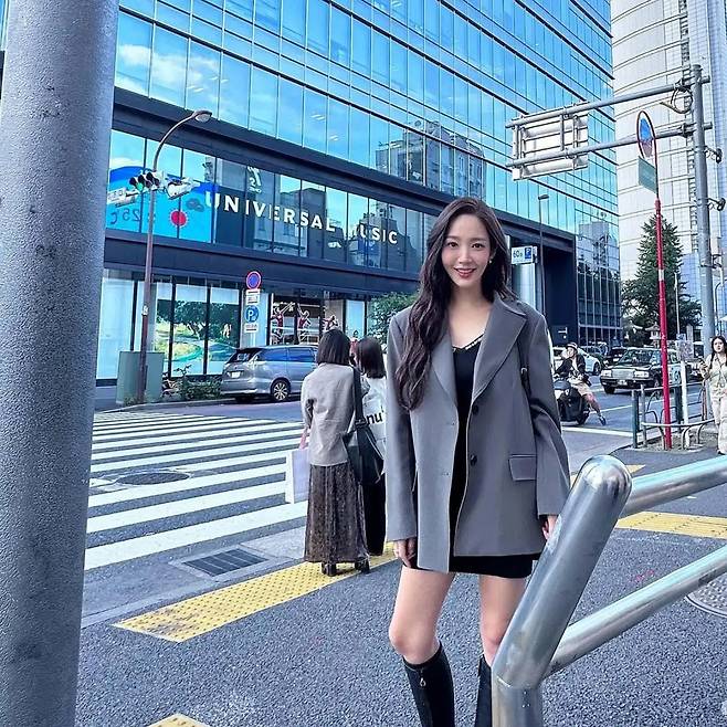 드롭 숄더 디자인의 재킷은 여유로우면서도 힘 있는 라인을 만든다. 여기에 미니 원피스와 블랙 롱부츠가 더해져 한층 당당한 느낌을 준다. 도심의 세련된 풍경과 어우러진 스타일은 포멀하면서도 모던한 감각을 동시에 갖췄다. 뉴욕이나 도쿄 같은 대도시의 거리에서도 어울릴 법한 패션으로, 박민영의 스타일리시한 면모를 잘 보여준다.