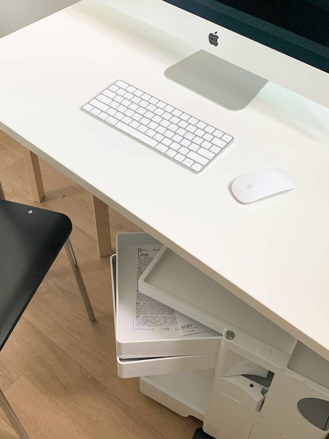 그 안쪽으로는 데스크톱과 책상을 두었고, 가장 안쪽 벽에는 행거와 수납장을 설치했어요.