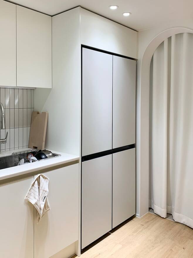주방과 거실의 경계가 모호해서 더 비좁아 보이는 듯했어요. 냉장고를 어느 위치에 놓아야 가장 효율적으로 공간을 활용할 수 있을지 정말 고민이 많았답니다.