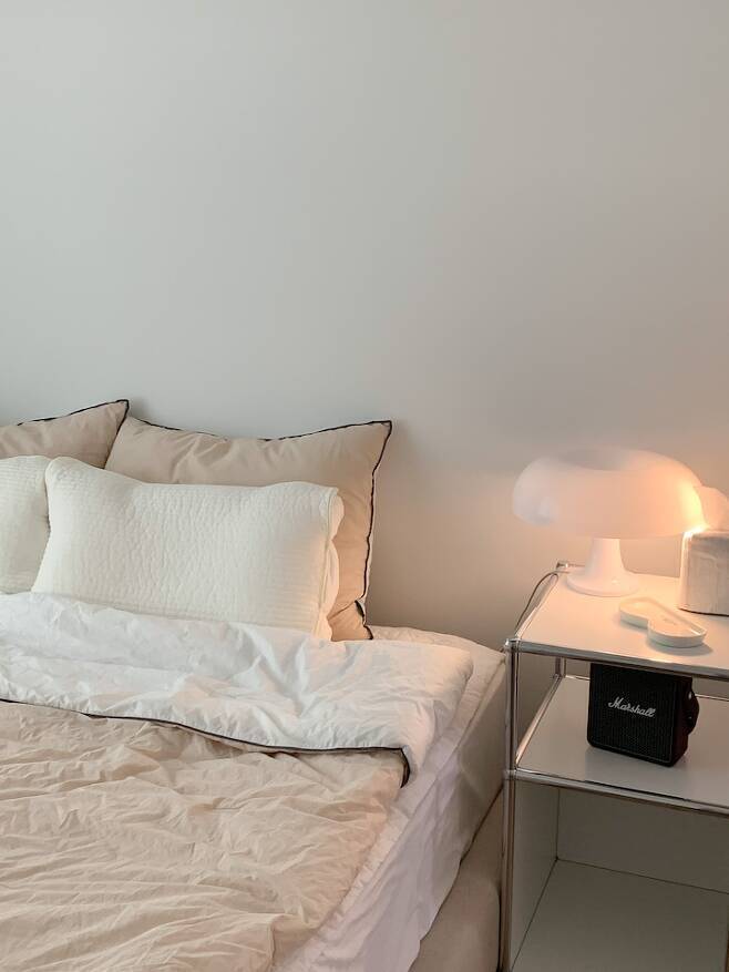 크게 특별한 점은 없는 안방이지만 방의 크기가 크지 않았던 만큼 헤드까지 높이 올라오는 높은 침대 프레임 대신, 파운데이션 프레임을 선택해 간결하고 깔끔하게 연출하고자 했어요.