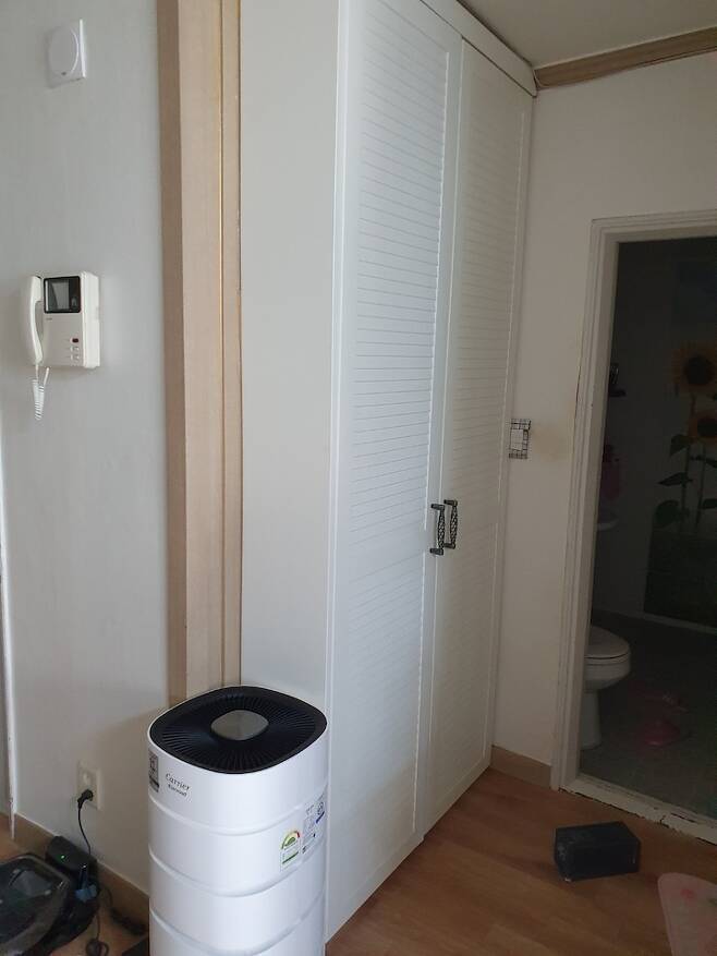 주방에는 도저히 놓을 공간이 없었던 김치냉장고는 에어드레서와 함께 작은방 입구 쪽에 나란히 자리하게 되었어요.