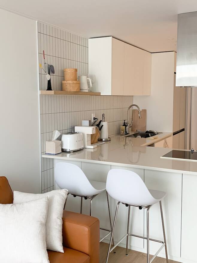 주방은 이렇게 변신했어요! 주방에서 가장 신경 썼던 부분은 우선, 저희 집에는 식탁을 놓을 공간적 여유가 없기 때문에 아일랜드 식탁을 활용해야 했는데요. 뿐만 아니라 조리공간도 충분하기를 원했어요. 때문에 아일랜드 식탁의 폭을 넓게 제작하게 됐고, 이 점이 주방을 굉장히 효율적으로 만들어주었어요.