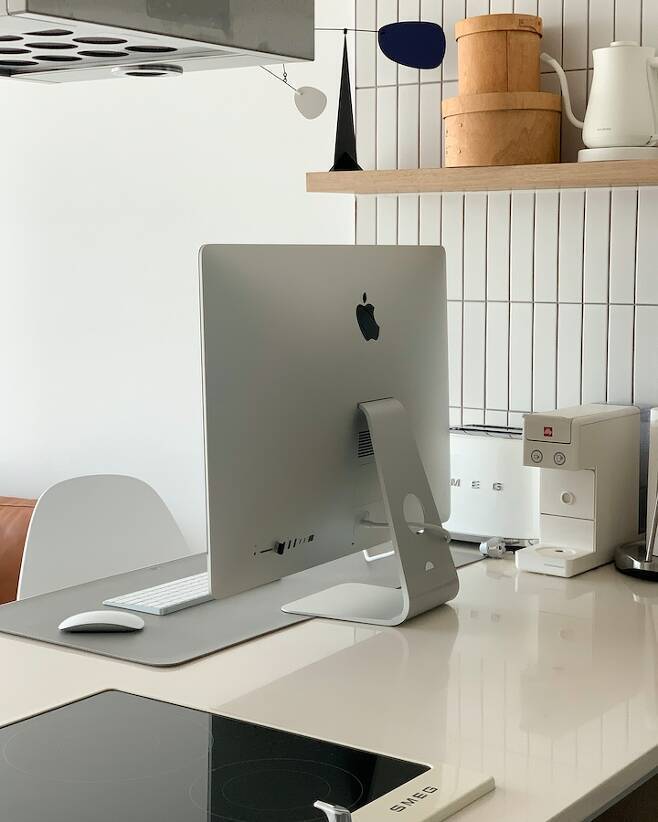 작은방에 책상이 설치되기 이전에는 데스크톱을 아일랜드 식탁에 놓고 업무를 보기도 했어요. 넓은 아일랜드 식탁의 장점이 식탁, 조리공간뿐만 아니라 이렇게 책상의 역할도 가능하다는 점 같아요.