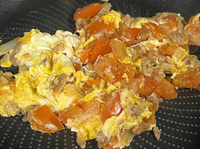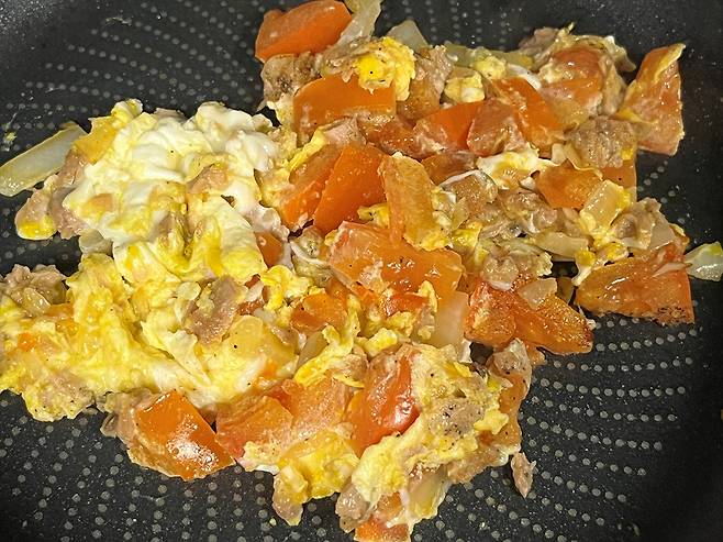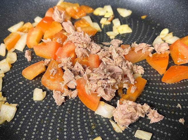 양파, 토마토를 볶고 여기에 참치까지 소량 곁들이면 단백질과 지방, 항산화 성분이 자연스럽게 보완됩니다. 계란에 부족하기 쉬운 오메가 지방과 감칠맛이 더해져 포만감이 오래가고, 아침 한 끼로 영양 균형을 맞추는 데 도움이 됩니다.