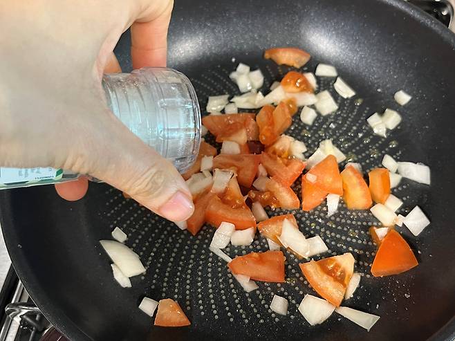 양파와 토마토는 썰어서 기름에 살짝 볶습니다. 소금으로 밑간을 하면 토마토와 양파의 감칠맛을 끌어올립니다.