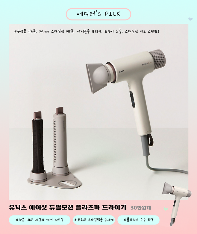 유닉스 에어샷 듀얼모션 플라즈마 드라이기는 2 in 1 제품으로 드라이어와 스타일러를 모두 사용할 수 있는 신박한 드라이기이다.