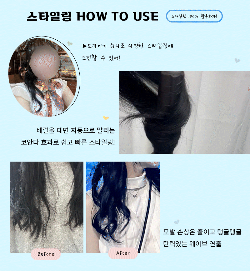 게다가 머리를 다 말리고 고데기를 하는 번거로운 과정이 아니라 드라이 바람으로 스타일링을 하는 거라서 바쁘디 바쁜 출근 시간에도 충분히 여신 머리를 연출할 수 있다는 큰 장점을 갖춘 제품. 미용실에 가지 않아도 집에서 간단하게 스타일링 할 수 있고 모발 건강도 케어할 수 있다니 너무 경제적인 메리트가 아닐 수 없다. 가성비 갑 of 갑!