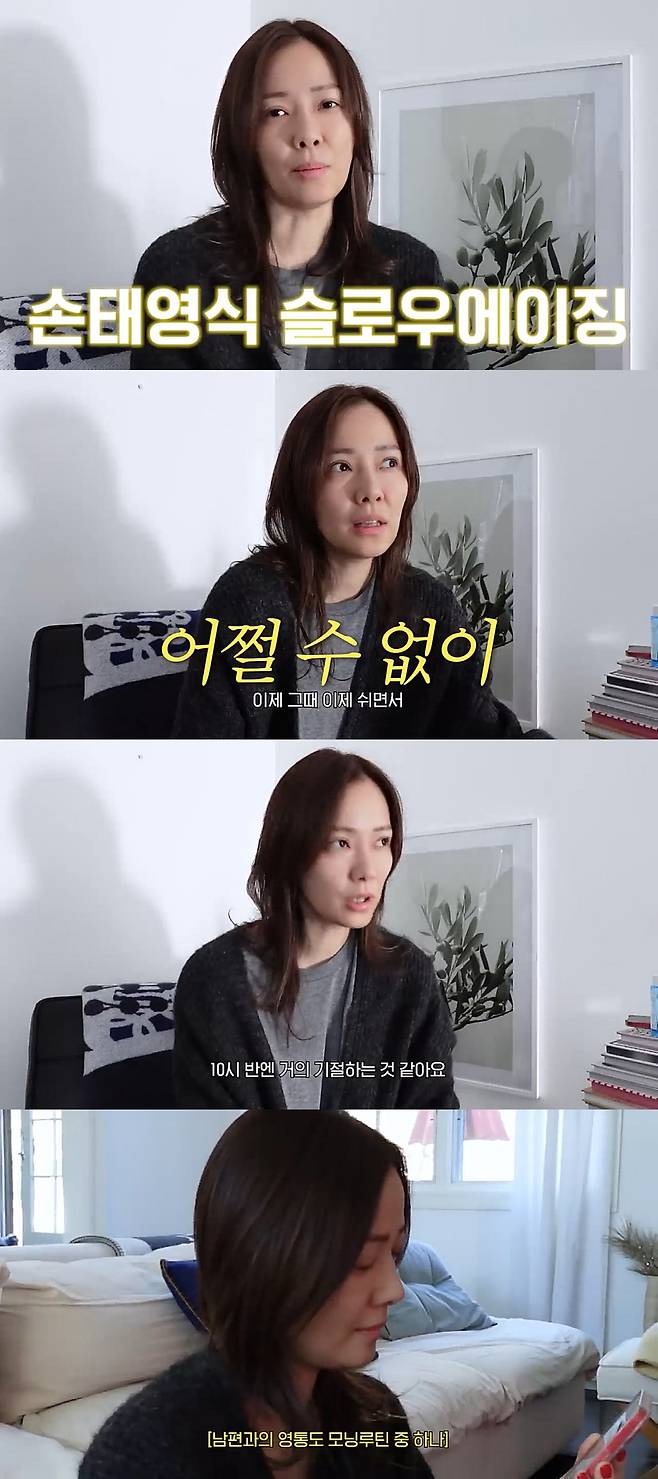 이 영상에서 손태영은 "동안 비법이라기보다 우리가 안 늙을 순 없다. 그 노화의 속도를 조금씩 줄여가는 방법을 알려드리겠다. 그런 걸 슬로우에이징이라고 부른다고 한다. 별거 없다. 별거 없는 게 참 지키기 어렵다"며 "채소는 별로 안 좋아한다. 유일하게 먹는 게 당근, 오이다. 하루에 대여섯 개씩 먹진 않고, 미니 오이를 두 개 정도 먹는다. 생당근도 좋아한다. 카페인 얘기를 하자면 하루에 커피 2잔 이상은 안 마시는 것 같다. 한잔, 많이 마셔봐야 두 잔. 집에 있을 땐 가끔 아메리카노를 마시는 데 반 잔밖에 못 마신다. 밖에서 마실 땐 무조건 카페라테. 우유 많이 커피 반샷으로 먹으면 커피우유 같은 맛이 난다"고 말했다.
